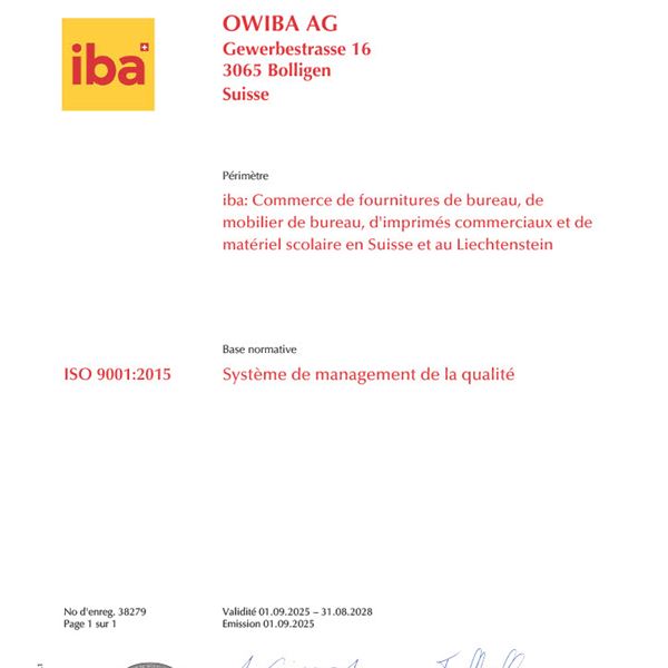En août 2025, iba a de nouveau reçu le certificat selon la norme ISO 9001:2015, qui est valable jusqu'en 2028.